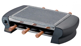 Raclette z kamienną płytą. Moc 1000 W; waga: 5.3 kg; kamienna płyta do smażenia (z rynienką), wymiar: 47 x 28 x 15 cm; wykonany ze stali nierdzewnej i tworzywa; regulacja temperatury; 6 tacek i 6 szpatułek. Produkt firmuje Swiss Raclette Association.